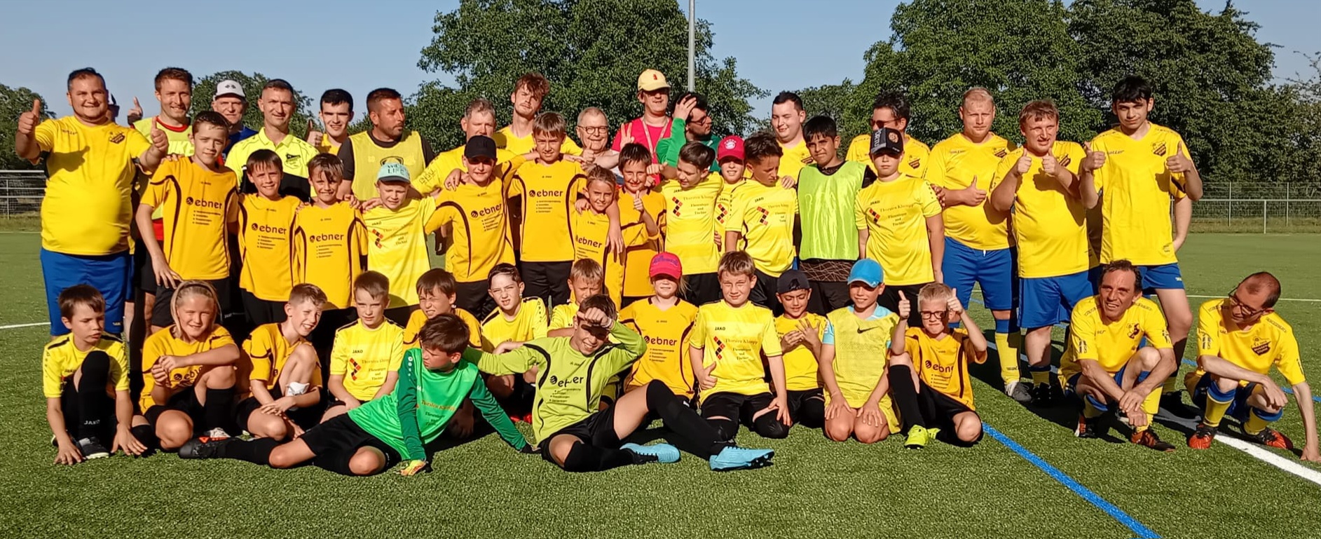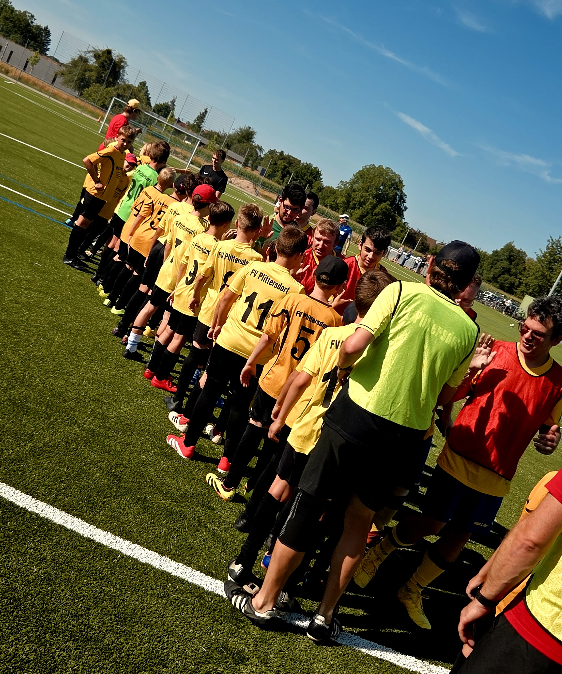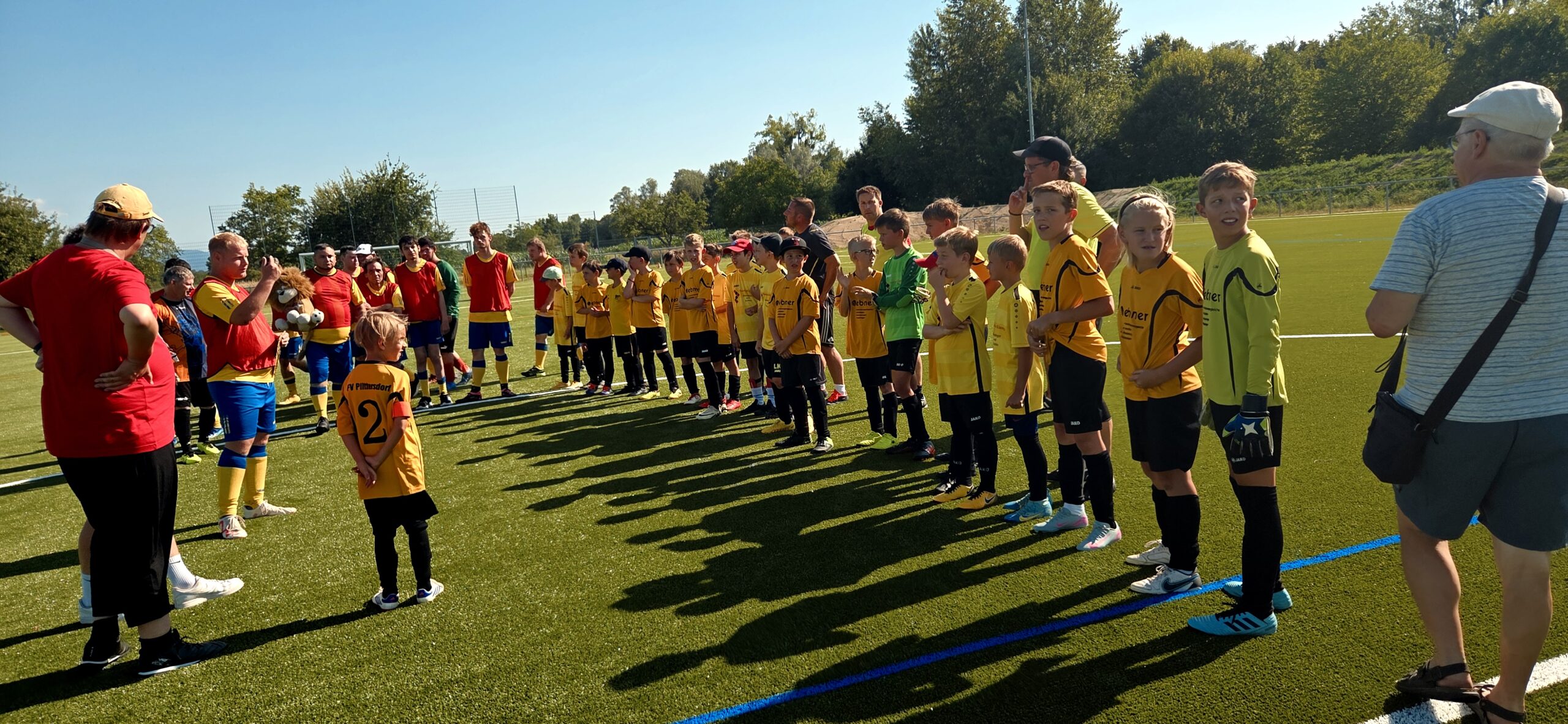 Gleich zwei Überraschungen gab es letzten Samstag bei der Abschlussfeier einer erfolgreichen Saison. Die Kids durften als erste Mannschaft überhaupt auf unserem neuen Kunstrasenplatz im Seefeld kicken. Dazu hatten wir die „Unzähmbaren Löwen“, die Inklusionsmannschaft des FV Muggensturm, eingeladen. Die Freude war groß, den neuen Rasen zu betreten. Auch das Freundschaftsspiel hat allen viel Spaß gemacht. Wir spielten 2 x 30 Minuten, unterstützt von zahlreichen Eltern am Spielfeldrand. Mit 5:4 haben wir knapp gegen die Löwen gewonnen. Da dies für unseren Daniel Horst ein Heimspiel war, musste er sich nicht entscheiden – sondern spielte je eine Halbzeit für Plittersdorf und für Muggensturm. Besonders gefeiert wurde ein erfolgreicher Elfmeterschuss von Bastian Stupfel. Im Anschluss ließen wir den Abend bei einer leckeren Pizza gemeinsam ausklingen und waren uns einig, dies im nächsten Jahr zu wiederholen.