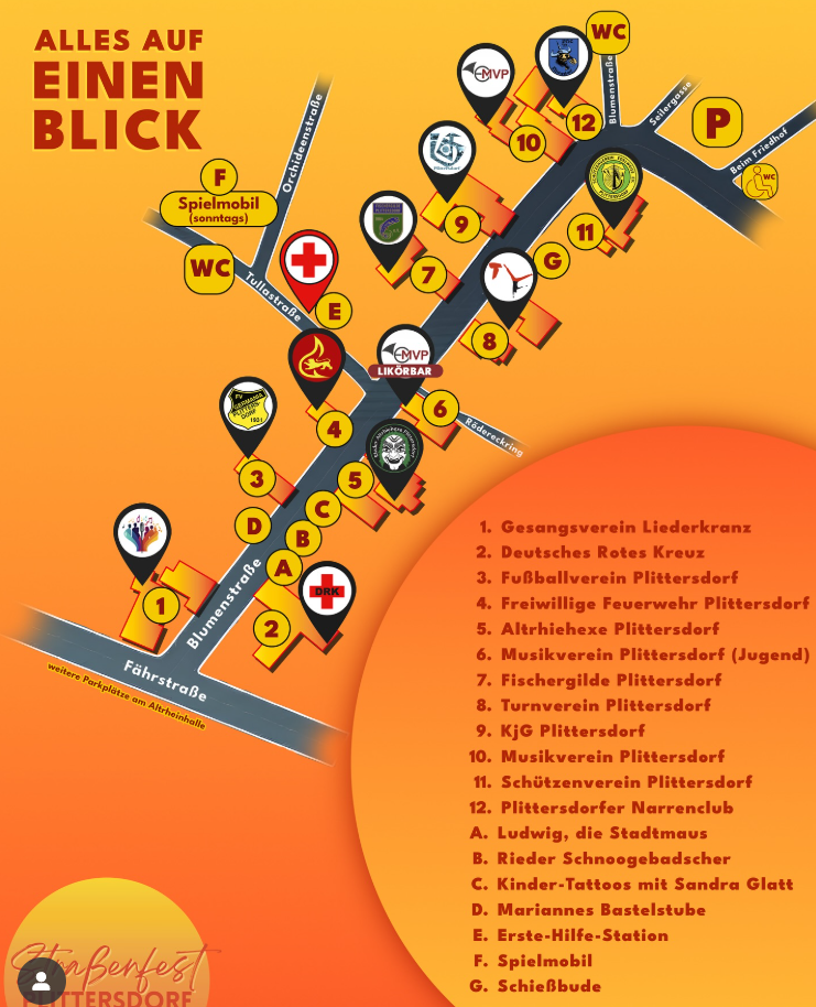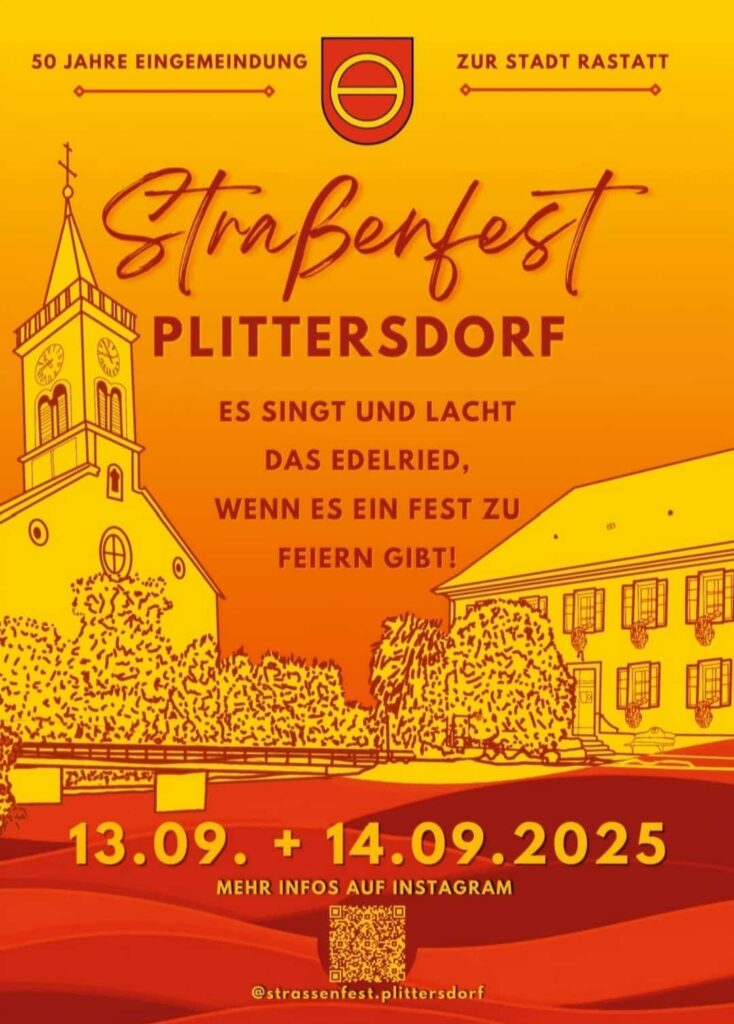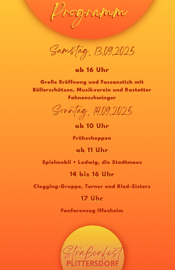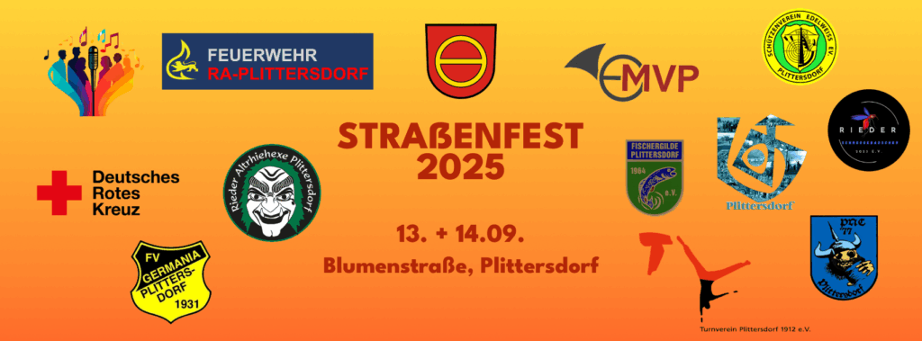 Das Plittersdorfer Straßenfest steht vor der Tür. Am 13. und 14. September 2025 singen, lachen und feiern wir im Herzen von Plittersdorf. Kommt vorbei uns erlebt ein Wochenende mit Musik, guter Laune und toller Gemeinschaft. Viele tolle Programmpunkte und das Engagement zahlreicher Vereine und Sponsoren werden dafür sorgen, dass alle Besucher unvergessliche Stunden in Plittersdorf erleben werden. Einen Überblick über die Veranstaltung findet ihr in den folgenden Grafiken: