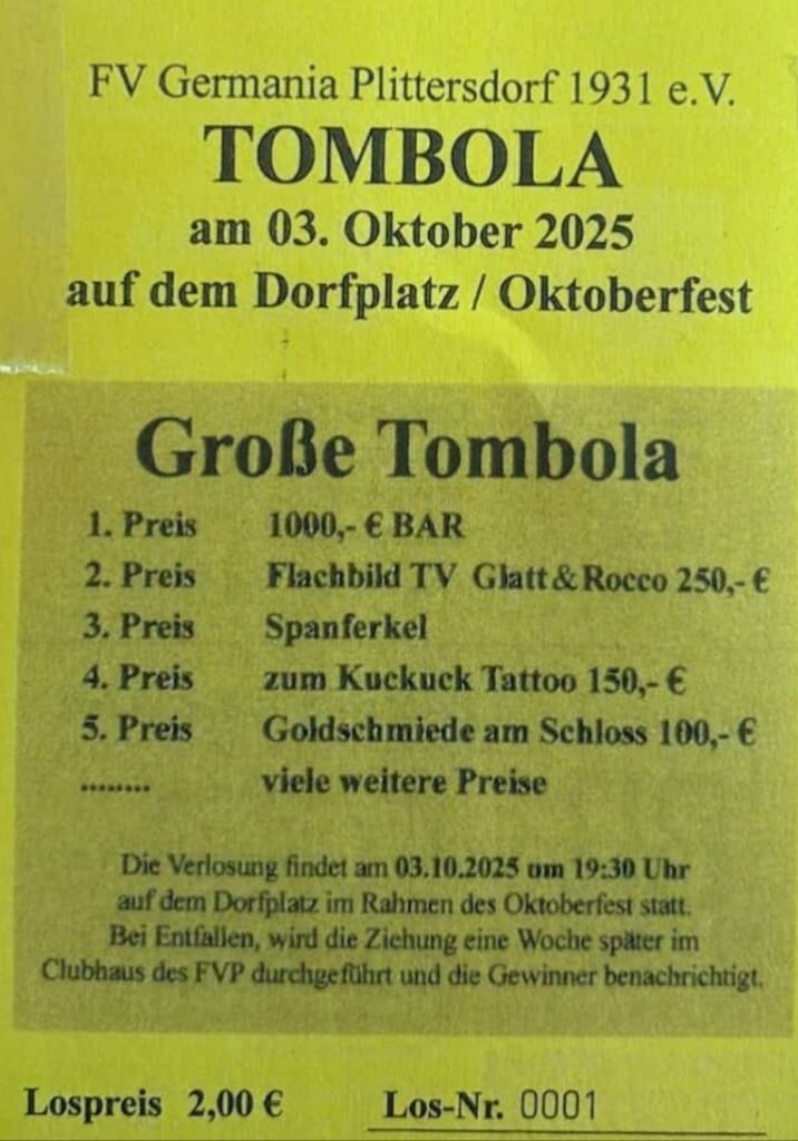 Auch unser alljährliches Oktoberfest, das dieses Jahr am Freitag, 03.10.2025, auf dem Plittersdorfer Dorfplatz stattfinden wird, wirft seine Schatten voraus. Ab sofort verkaufen wir für die große Tombola wieder Lose, die ihr zum Preis von 2 Euro bei allen Verwaltungsmitgliedern und Spielern sowie unserem „Chef-Losverkäufer“ Daniel Horst erhalten könnt. Auch beim Plittersdorfer Straßenfest werden wir die Tombola-Lose an unserem Stand verkaufen. Der Hauptpreis beträgt in diesem Jahr 1000 € in bar, darüber hinaus verlosen wir weitere wertvolle Sachpreise.