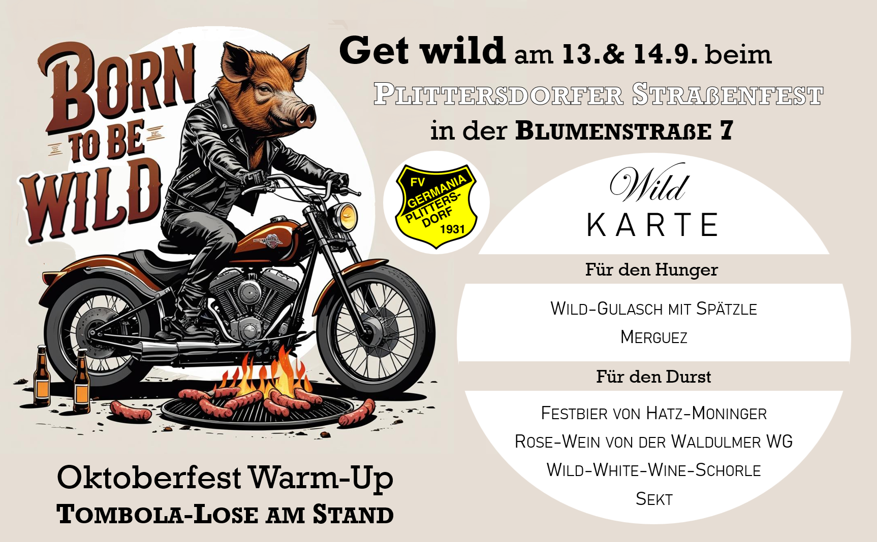 Auch der FV Plittersdorf beteiligt sich natürlich mit einem eigenen Stand (Nr. 3), der in der Blumenstraße 7 zu finden ist. Unter dem Motto „Get wild“ bieten wir u.a. leckeres Wild-Gulasch mit Spätzle und eine Auswahl „wilder“ Getränke an (z.B. Hatz-Moninger-Festbier, Weine der Waldulmer Winzergenossenschaft, Sekt). Wir würden uns freuen, wenn wir am Festwochenende zahlreiche Besucher an unserem Stand und dem Hof in der Blumenstraße 7 empfangen dürften. Der FV Germania freut sich über euer Kommen!